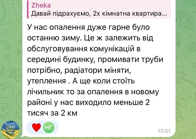 «У нас опалення дуже гарне було останню зиму. Це ж залежить від обслуговування комунікацій у будинку: треба промивати труби, міняти радіатори, утеплювати будівлю. А ще коли стоїть лічильник, за опалення у новому районі за 2-кімнатну квартиру виходило менше 2 тисяч.»