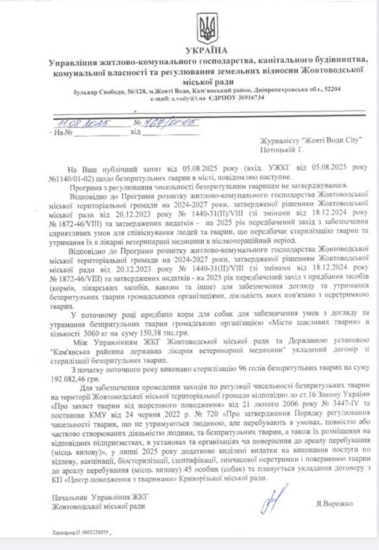Тоді нам у відповіді зазначили, що спеціальної програми з регулювання чисельності тварин у Жовтих Водах не затверджували. Проте у Програмі розвитку житлово-комунального господарства громади на 2024–2027 роки передбачено окремі заходи: стерилізацію тварин та утримання їх у лікарні ветеринарної медицини після операції.