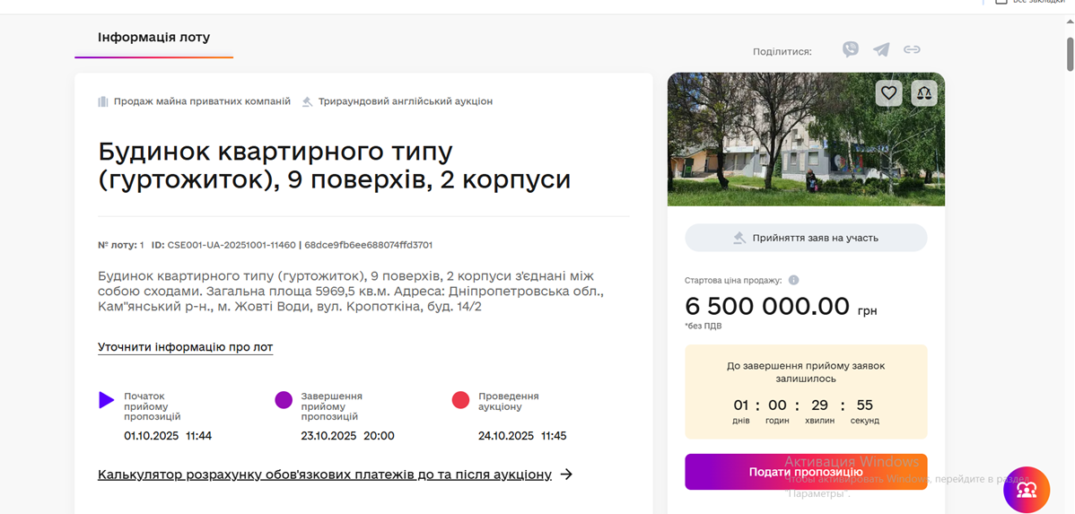 Продаж відбудеться у форматі трираундового «англійського» аукціону, що передбачає подання закритих цінових пропозицій. Стартова вартість — 6 500 000 гривень (без ПДВ), гарантійний внесок становить 325 тисяч гривень. Кінцевий строк подання заяв — 23 жовтня 2025 року, аукціон запланований на 24 жовтня о 11:45.