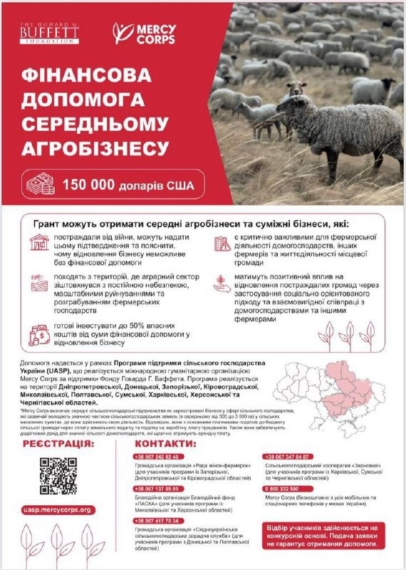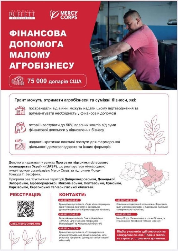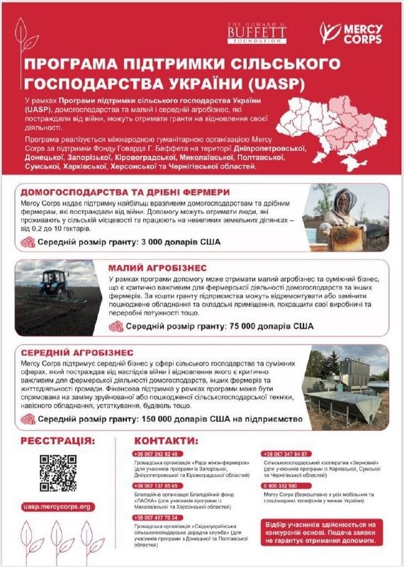 Домогосподарства та представники малого й середнього агробізнесу, які постраждали від війни, можуть отримати фінансову допомогу для відновлення сільськогосподарської діяльності. Програма реалізується міжнародною гуманітарною організацією Mercy Corps за підтримки Фонду Говарда Г. Баффета у десяти областях України, зокрема на Дніпропетровщині.