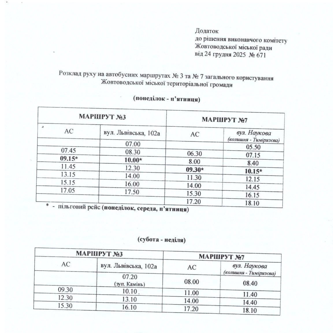 Із 01 січня 2026 року у Жовтих Водах діятиме новий розклад руху автобусів на маршрутах №3 та №7. Зміни стосуються як будніх днів, так і вихідних.