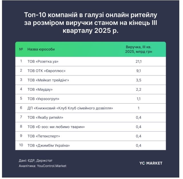 ТОП‑10 онлайн‑ритейлерів за 9 місяців 2025 р. заробили майже 40 млрд грн, із яких 30,2 млрд грн виручки (76%) припадає на дві компанії корпоративної групи Rozetka.