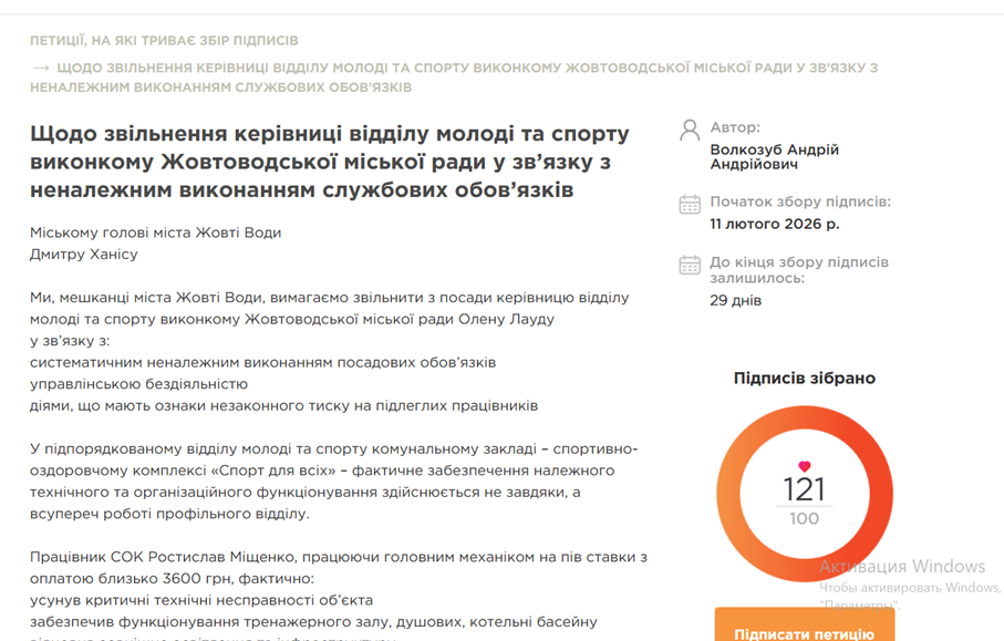 11 лютого місцевий мешканець та військовий Андрій Волкозуб зареєстрував петицію щодо звільнення керівниці відділу молоді та спорту виконкому Жовтоводської міської ради Олени Лауди.