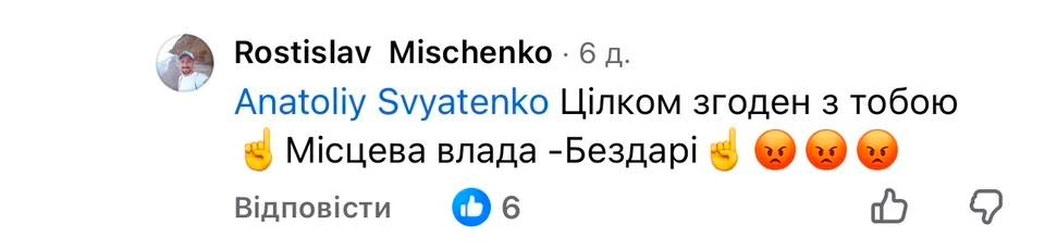 Під даним матеріалом у Facebook Ростислав Міщенко залишив коментар: «Місцева влада — Бездарі».