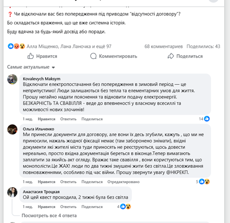 «Я цей жах пережила два роки тому. Зимою відключили світло без попередження, а оформлення нового договору зайняло три тижні», — зазначила інша жителька.