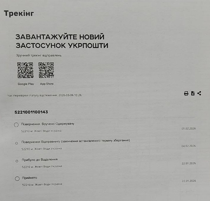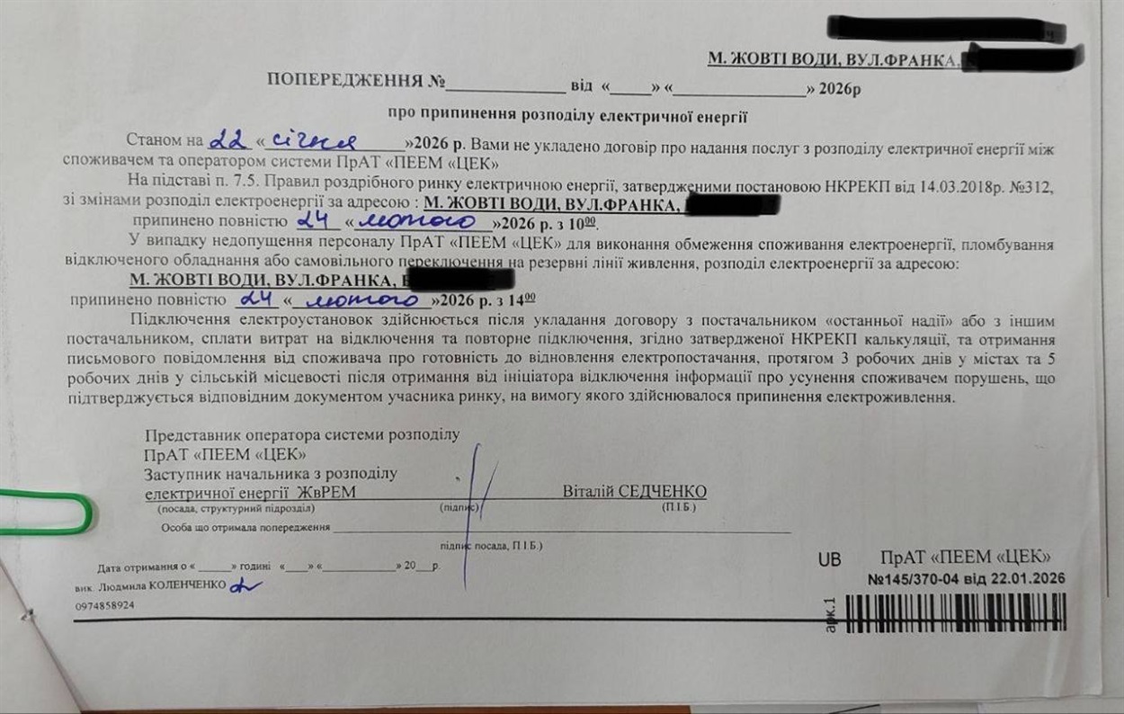 У ЦЕК також повідомили, що направляли споживачам письмове попередження. У компанії надали редакції копію попередження про відключення, датовану 22 січня, а також трекінг із «Укрпошти», де зазначено, що лист було отримано 5 лютого.