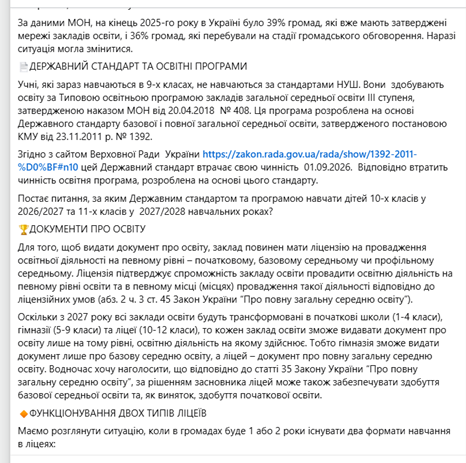 Найбільше питань стосується нинішніх дев’ятикласників. Освітній омбудсмен звернув увагу: ці діти навчаються ще за старими державними стандартами, які втрачають чинність з 1 вересня 2027 року. Через це виникло питання — за якими програмами вони завершуватимуть 10–11 класи.