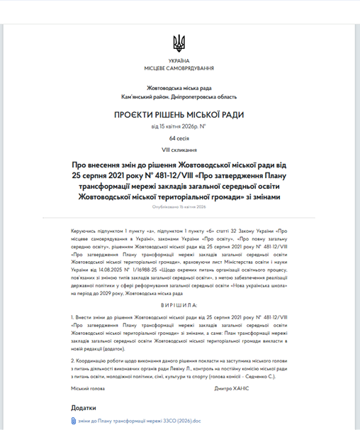 У Жовтоводській міській раді тема трансформації шкільної мережі вже на порядку денному. 11 березня 2026 року був зареєстрований проєкт рішення щодо коригування плану трансформації закладів освіти відповідно до програми НУШ.